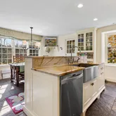 large Wolf range, radiant-heated stone floor, island with farmhouse sink and natural quartz