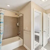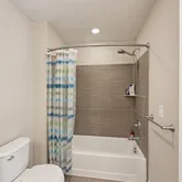 ct for a hoe office or study area. The upper bathroom features a double vanity and tiled shower/bath, and the convenien