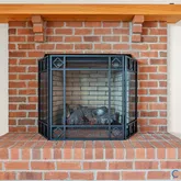 flooring, a spacious living room, and a brick gas log fireplace that serves as a cozy focal