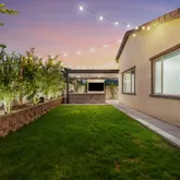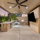 Full outdoor kitchen: grill, griddle, mini fridge, and sink. Outdoor entertainment area with TV & speaker connections. Landscape lighting throughout the front and back. Plenty of space for a future pool