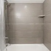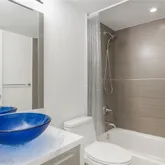 remodeled kitchen and bathroom with sleek cabinetry, quartz countertops, stainless steel appliances, built-in