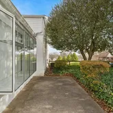 The side yard is lined with mature landscaping, offering a peaceful outdoor setting.