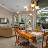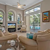 Climate resilient landscaping in the garden featuring mature perennials and pop up irrigation. An open floor plan with a living, dining and kitchen combo. 12 foot high ceilings with custom cornices in the living room and kitchen allow for improved airflow and give an expansive feel to the space. The living room serves as a true sanctuary whose focal point is a tall triple arched window that invites an abundance of natural light and features a bespoke media wall that can house your TV. The kitchen is anchored by rich wood cabinetry and stainless steel appliances which add a sleek modern contrast. Features such as a skylight that floods the kitchen with natural light and a pantry with generous storage contribute to the artisanal experience The solid countertops have ample space to assemble nutritious meals, to be enjoyed in the dining nook next to tall glass windows overlooking the pool. Sliding glass doors in the living room and the dining room let the sunshine in and open onto the screened in pool patio. The pool, resurfaced in 2021and furbished with a new pool motor in 2025 has solar heating which allows for year round use. The screens around the pool protect from insects and debris allowing you to unwind without distraction and the expansive patio has plenty of space for lounge chairs and a BBQ island. The primary suite has been designed to be a tranquil heaven. Again, sliding glass doors opening to the patio and windows provide for abundant natural light. The coffered ceilings, custom cornices, generously sized his and her closets, dual vanities in the bathroom and a spacious walk in shower, bathtub for relaxing and water closet for privacy all inspire a spa experience. Two guest bedrooms are thoughtfully positioned in the split floor plan. Each guest bedroom is generously sized with custom closet space and easy access to a nearby guest bath. These rooms can be used as a home office, or hobby space or a reading nook! The oversized 2 car garage has plenty of extra storage cabinets! A new roof was installed in 2021. Make an appointment to see this beautiful home in the stellar golfing community of Glen Lakes! Glen Lakes offers a dynamic social life that centers around a 35,000 square foot clubhouse offering country club amenities, such as tennis courts, pickle ball courts, fitness center, swimming pool and a superb restaurant. Golf memberships can be purchased for the 18-hole, 6,782 yard championship golf course. This resort style community is dotted with small lakes and sidewalks and has a 24 hour gated manned entrance.