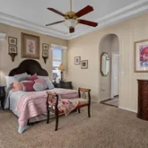 - Interior Features: Ceiling Fan(s), Crown Molding, High Ceilings, Kitchen/Family Room Combo, Open Floorplan, Primary Bedroom Main Floor, Solid Surface Counters, Solid Wood Cabinets, Split Bedroom, Thermostat, Walk-In Closet(s), Window Treatments