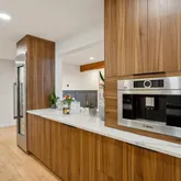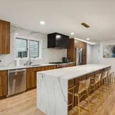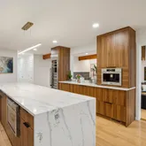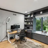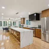 Indulge your culinary passions in the gourmet kitchen, featuring custom cabinetry with pullouts, an oversized island with waterfall quartz countertops, and top-of-the-line Thermador and Wolf appliances. A cozy breakfast nook bathed in natural light provides the perfect spot for morning coffee or engaging conversations with guests.