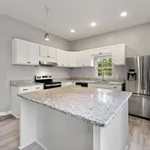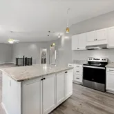- Kitchen Features: Breakfast Bar, Cabinets White, Kitchen Island, Stone Counters, View to Family Room