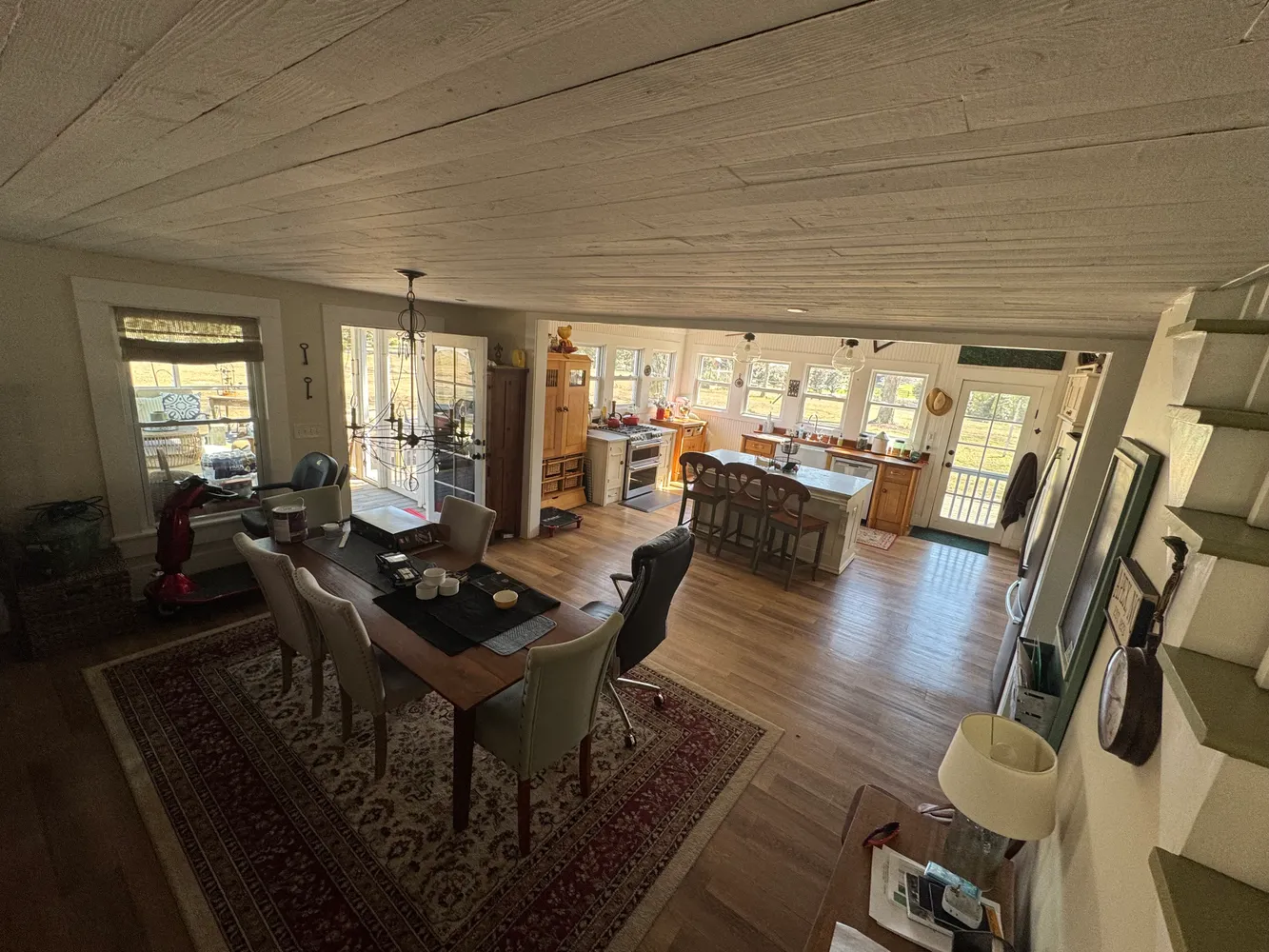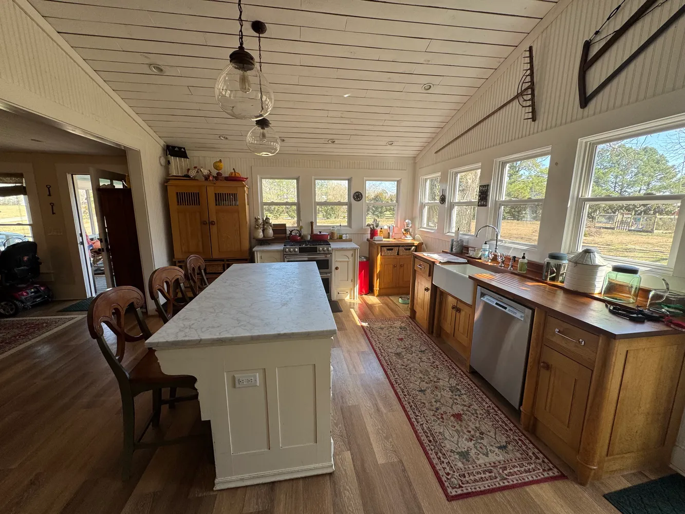Inside, you'll find custom floating kitchen shelves, real teak wood countertops (oiled monthly), and a marble island. The original center column in the living area, repurposed wood elements in the ceiling, and other reclaimed materials add warmth and authenticity, along with the fireplace. The kitchen is equipped with newer appliances, including a 3-year-old premium gas stove and Bosch dishwasher. All electrical wiring has been replaced for reliability.