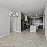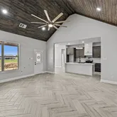 with custom cabinets, granite countertops, stainless appliances, wood beam ceiling , wood look herringbone laid tile
