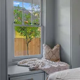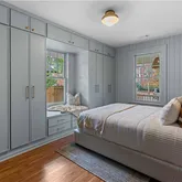 The primary bedroom features a custom built-in closet system, while the secondary bedroom brings its own charm with a window seat and dual closets. The renovated bath blends classic and modern with timeless tile and an antique medicine cabinet.