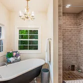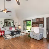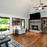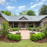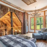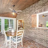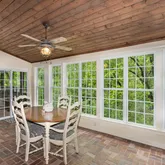As you approach, follow a meandering path through majestic trees to the rocking-chair front porch, a perfect spot to enjoy your morning coffee. Step inside to discover a timeless design featuring decorative wood ceilings, exposed brick, and warm accents that invite you to relax by one of two fireplaces or find solace in the tree-lined sunroom.