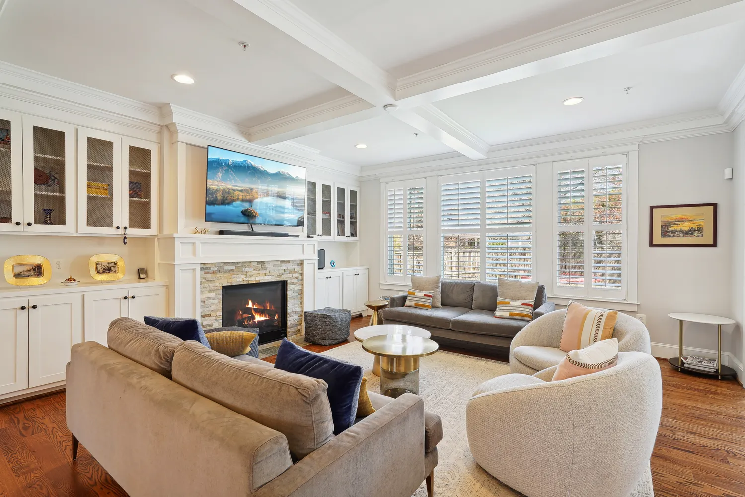 As you step inside, you are greeted by an inviting foyer leading to an open floor plan with high ceilings and walls of windows that flood the space with natural light. The main level features a formal living room, a large dining room, a Chef's Kitchen with huge marble island, a breakfast area, and a main level library/home office. The family room boasts a cozy gas fireplace and built-ins, perfect for family gatherings.