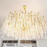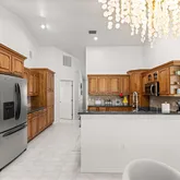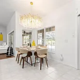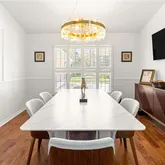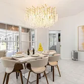 finishes, and a dining room chandelier with amber lighting. The spacious living room centers