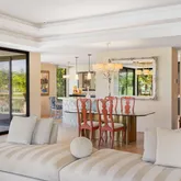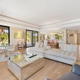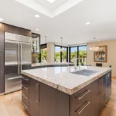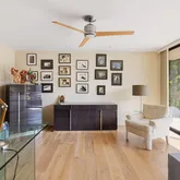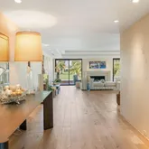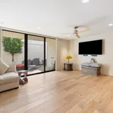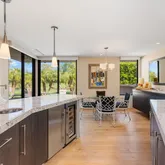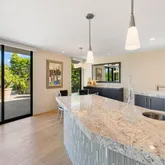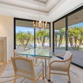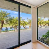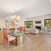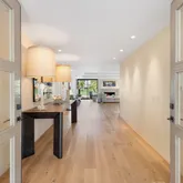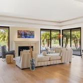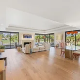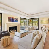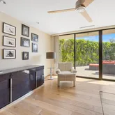 A dramatic entry leads into a light-filled interior where French wide-plank white oak floors and floor-to-ceiling Fleetwood glass doors establish a seamless connection to the outdoors. Coffered ceilings with soft indirect lighting add architectural depth while maintaining a warm, livable elegance. The home strikes a refined balance between modern sophistication and everyday comfort.