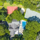 Enjoy resort-style living at its finest in this exceptional Quogue Village residence, nestled on 2.02 +/- acres bordering a 6.5 acre reserve. Thoughtfully crafted with both luxury and leisure in mind, this 7 bedroom, 9 full bath, 4705 sf +/- home offers an unmatched array of amenities. The main level features a spacious foyer, leading to a light filled cathedral ceiling living room with fireplace, an expansive dining room seating 12 or more, Open kitchen with breakfast eat-in area , and a Great room with a wet bar, all looking out through Glass doorways to the luxurious yard. Completing the main floor there are two en-suite bedrooms and an additional full bath. The second floor offers an oversized primary en-suite bedroom with marble double vanity bathroom, walk in closet, sitting area and a private balcony. Also included are 4 guest en-suite bedrooms one with a private balcony and two that share balcony. The finished lower level presents flexible space, ideal for a gym or media room. Outdoor living shines with generous seating surrounding the heated pool, spa, and fully equipped outdoor kitchen-ideal for al fresco dining and outdoor gatherings. Har-Tru tennis, pickleball, basketball, and beach volleyball courts provide endless recreation, while a firepit, barbeque, vegetable garden, outdoor shower and therapeutic ice bath evoke the feel of a relaxing retreat. Located minutes away from Quogue Village beaches and local shops, this residence redefines Hamptons luxury. Blending refined design with premier amenities, it offers an entertainers dream and a resort-like experience year-round.