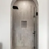 - Room Description: Main Level Primary En-Suite Bathroom with Walk In Shower with Rounded Archway, Herringbone Tile