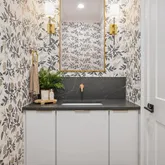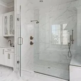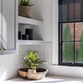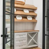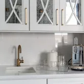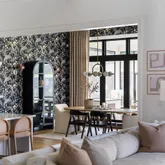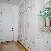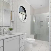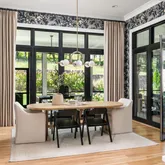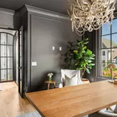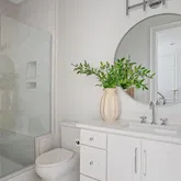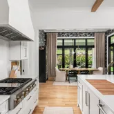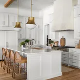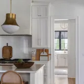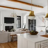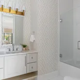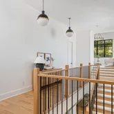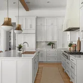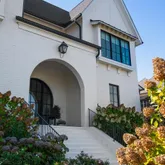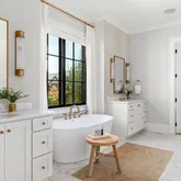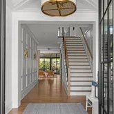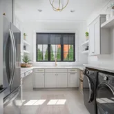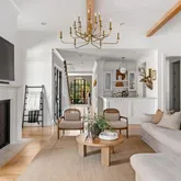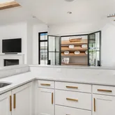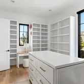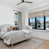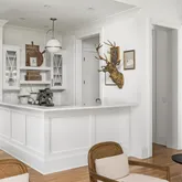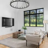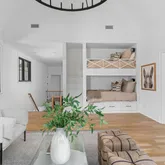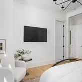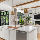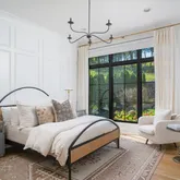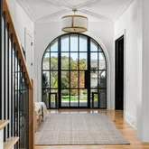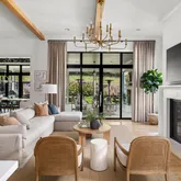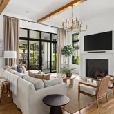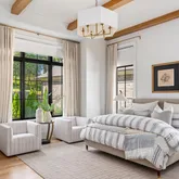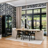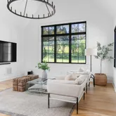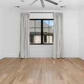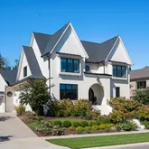 The bright white brick exterior sets the tone, while inside you’ll find open, light-filled spaces, warm hardwood floors, and sleek black-framed windows that give the home a clean, modern feel. The main level was designed with entertaining in mind—featuring a large chef’s kitchen with an oversized island, a full bar, and a wine closet that’s both stylish and practical. The primary suite feels like a private getaway, with a spa-like bathroom, soaking tub, double vanities, and even its own wet bar.