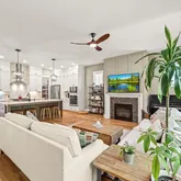 Just off the entry, an office framed by glass French doors offers the perfect space to work from home, study, or create. A full bathroom on the main level adds both function and flexibility for guests. Flowing further inside, the home opens up to a bright and spacious kitchen, where an oversized island, quartz countertops, and stainless steel appliances make both everyday meals and gatherings with friends a joy. The kitchen overlooks the living and dining areas, with sunlight pouring in through tall windows and a fireplace anchoring the space with warmth.