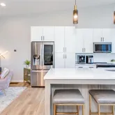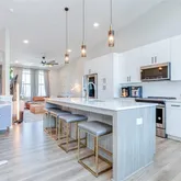 - Kitchen Features: Cabinets White, Kitchen Island, Stone Counters, View to Family Room