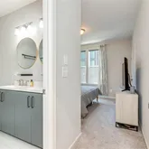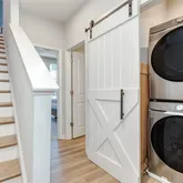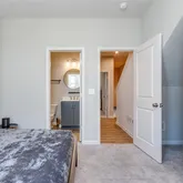 On the second level, you’ll find two spacious bedrooms. The primary suite offers a spa-like retreat with a tiled frameless glass shower, premium fixtures, and power shades. The secondary bedroom includes its own beautifully updated bathroom with a tiled shower/tub combo, matte black finishes, and dual access for guests. The laundry room is conveniently located on the same floor.