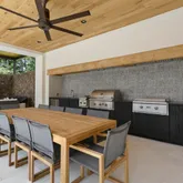 - Exterior Features: Built-in Barbecue, Covered Courtyard, Landscaping Lights, Outdoor Grill, Outdoor Kitchen, Private Yard, Rain Gutters
