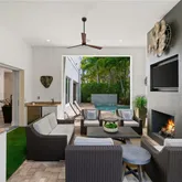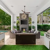 The private lanai is designed for entertaining and relaxation, featuring a brand-new screen enclosure, cozy fireplace, TV, built-in grill, and beverage refrigerator—an ideal setting for gatherings or quiet evenings at home.