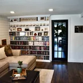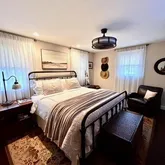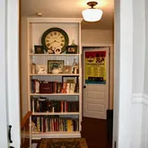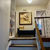 The upper level offers custom book shelves, wood flooring, generously-sized bedrooms, each with plenty of closet space and large windows. The master bedroom is especially serene, offering a peaceful retreat after a long day. Both full bathrooms have been thoughtfully designed with modern fixtures, elegant lighting, pocket doors and tasteful finishes, offering both style and functionality.