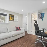 comfort and privacy. Downstairs, there is an additional 1,087 sq ft (approx.) of finished basement space. This level includes a large carpeted area, a laundry area with front-loading machines, ample storage, and a private entry to the home. Outdoor living is a highlight, with a spacious deck overlooking the deep, tree-