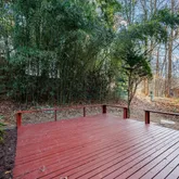 The interior has been freshly painted throughout and features hardwood floors across the main level. The entry includes a convenient coat closet and opens to a dining area that flows into a spacious living room with a fireplace. Sliding glass doors lead to a private rear deck overlooking trees, creating an ideal indoor outdoor living space.