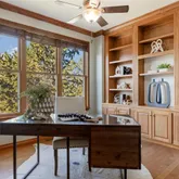 - Room Description: Well-appointed office space featuring glass double doors and a wall of built-in shelving