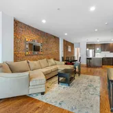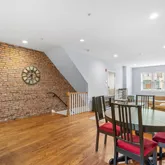 a bright, open, and airy main level boasting hardwood floors and an exposed brick wall that