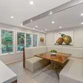 Prepare to be amazed as you venture further into the kitchen, reminiscent of a magazine spread. A cozy sitting area with a desk and an oversized booth create a charming space for family meals, work, or relaxed conversations over coffee.