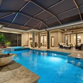 - Pool Features: Child Safety Fence, Deck, Gunite, Heated, In Ground, Lighting, Outside Bath Access, Salt Water, Screen Enclosure