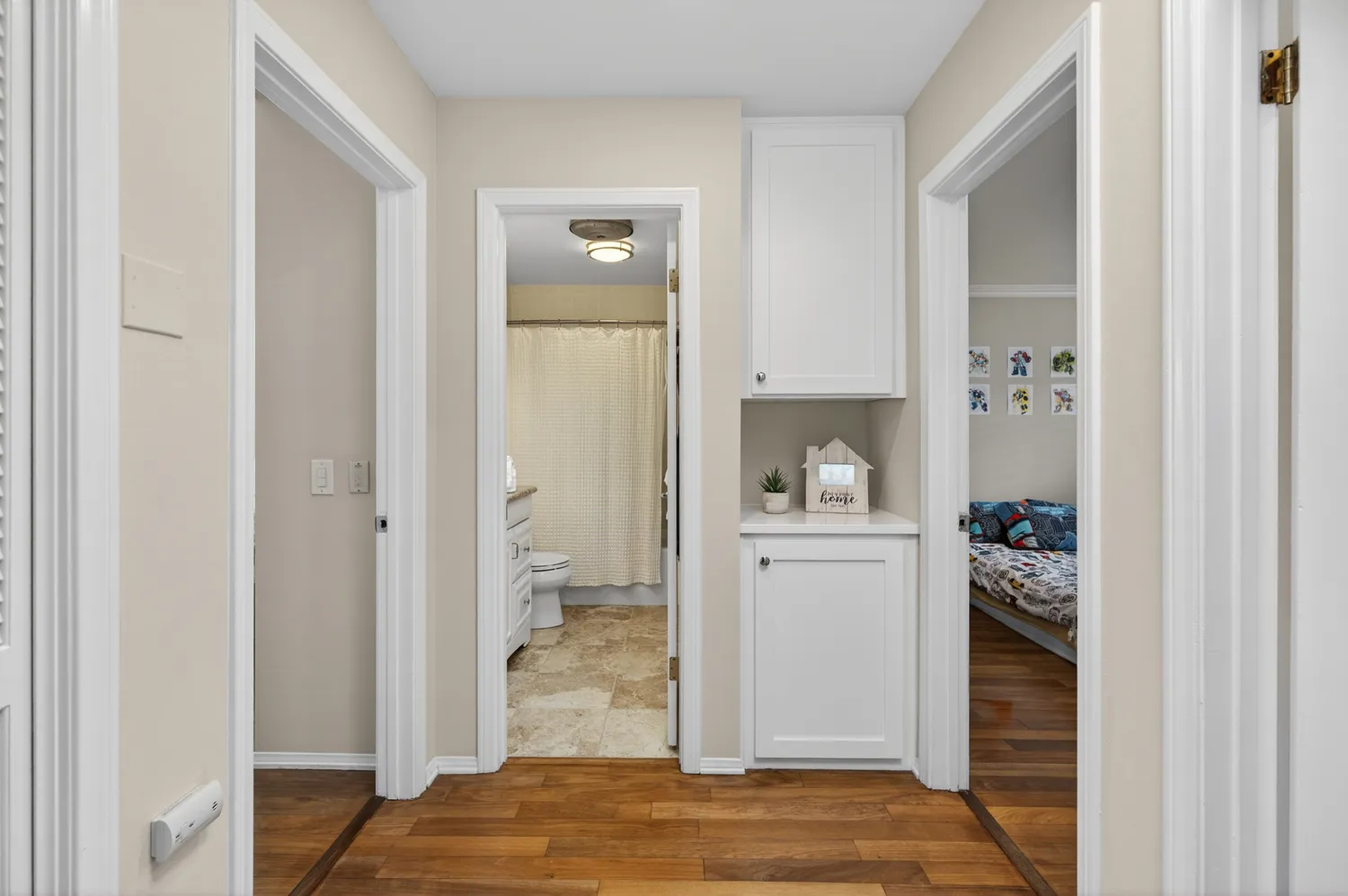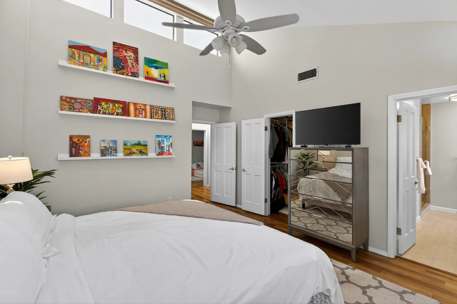 Upstairs the primary suite is a serene retreat, boasting high ceilings, abundant natural light, a generous walk-in closet, and a spa-like en-suite bathroom with a separate shower. Two additional bedrooms are generously sized and share a full bathroom, providing comfort and convenience for family or guests.