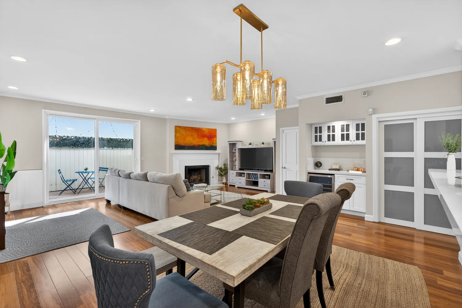 The expansive layout is anchored by a generous living and dining area, perfect for family time, casual evenings, or stylish entertaining by the Caesarstone fireplace. A sun-filled private patio...Welcome to a bright and inviting townhome nestled within a private five-unit building in the heart of Santa Monica, where thoughtful design meets effortless coastal living. This elegantly appointed 3-bedroom, 2.5-bathroom residence features high ceilings, classic crown molding, and a spacious open floor plan.