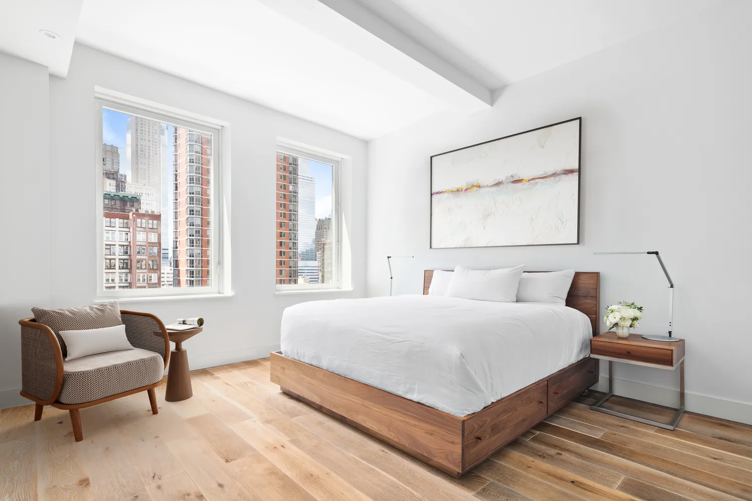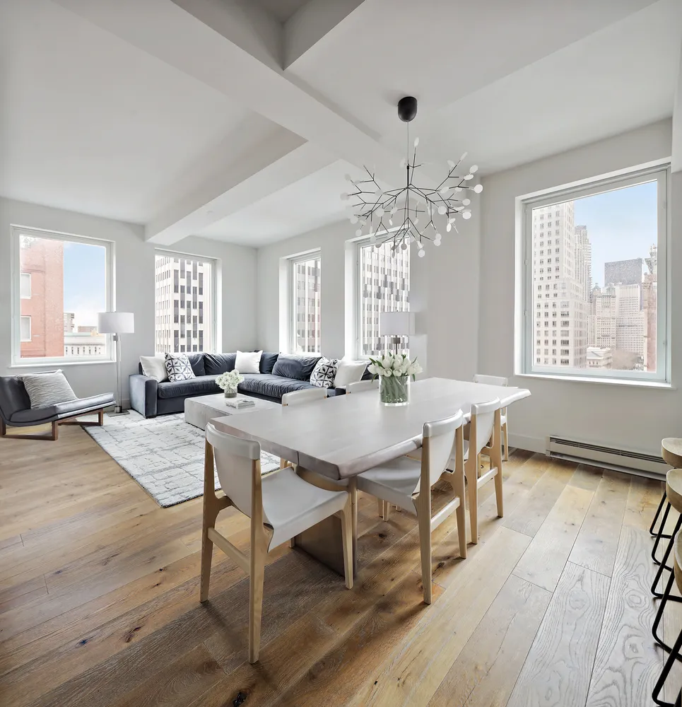 Perched high on the 12th floor and wrapped in a dozen 7-foot-tall windows to the south and east, this fine 1,917-square-foot-home bestows an airy and inviting atmosphere. Beamed ceilings and designer lighting soar overhead, and wide-plank white oak floors run under foot. The expansive corner great room provides a generous footprint for living and dining...Bask in extraordinary light and luxury in this beautiful three-bedroom, three-and-a-half-bathroom home in a premier, full-service Tribeca condominium.