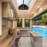 every room, the home is alive with natural light and surrounded by expansive decks and patios that invite effortless entertaining. At its heart lies a gourmet's dream kitchen, culinary showcase with appliances coveted by discerning culinary masters...A rare blend of timeless architecture and modern sophistication. This estate captures the essence of California living with soaring 22-foot ceilings, walls of glass, and a seamless connection between indoors and out. Designed to frame panoramic views from