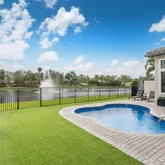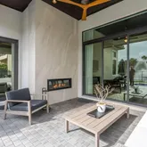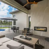 Outdoor living is elevated with a covered patio, a front entrance accented by dark-stained cedar, low-maintenance turf, and a heated saltwater pool perfectly positioned for all-day sun. A SWAT misting system enhances comfort, making the outdoor space ideal for year-round enjoyment and entertaining.