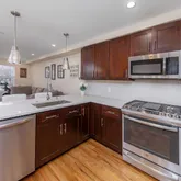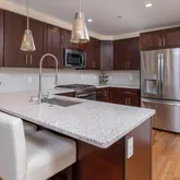 A modern kitchen with quartz countertops and stainless steel appliances