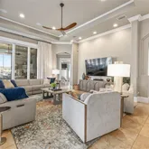 - Interior Features: Ceiling Fan(s), Central Vacuum, Eating Space In Kitchen, High Ceilings, Kitchen/Family Room Combo, Open Floorplan, Primary Bedroom Main Floor, Sauna, Solid Surface Counters, Walk-In Closet(s)