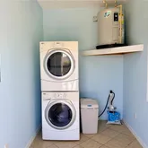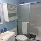 features a full bathroom with walk-in shower and glass doors, plus washer and dryer and a