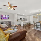 - Interior Features: Balcony, High Ceilings, Kitchen Island, Kitchen Family Room Combo, Quartz Counters, Tub Shower, Kitchen/Dining Combo, Living/Dining Combo