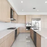 The sleek, modern kitchen is a chef's dream, boasting upgraded oak cabinetry, gleaming white quartz countertops, and stainless steel appliances. Downstairs, elegant white porcelain tile flows seamlessly throughout, while the upstairs showcases light-toned engineered wood flooring for a warm and inviting touch.