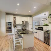 - Room Description: Eat-in kitchen with granite countertops, white cabinets, gas cooktop, stainless appliances, wine fridge, and warming drawer.