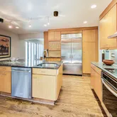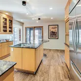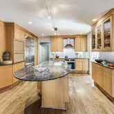 a large island with a snack bar, and amazing prep and storage space. The