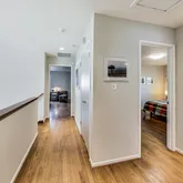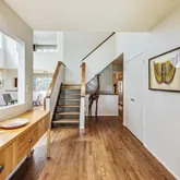 Floating hardwood stairs lead to the striking updated primary suite with a custom