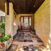 neighborhood. Lush foliage surrounds the home and the large yard. The grand entry is a