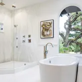 - Bathroom: Double Sinks, Marble, Shower and Tub, Stall Shower, Steam Shower