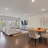 The main floor offers bright, open sight-lines across the living and dining spaces, with southern exposures drenching the home in natural light throughout the day. Gleaming wide plank hardwood floors on the main level invite you to sit at your massive, 10-foot eat-in island, with quartz countertops. A spectacular Kitchen-Aid appliance suite with a gas-fired range and externally exhausted fume hood top off this luxury kitchen. A large main floor office/den, a proper walk-in pantry, powder room, and a party-sized deck off the kitchen/rear of the home complete the main level. On the second level, the oversized and light-filled primary suite contains two large walk-in closets and a lovely, spa-like en-suite bathroom with floor-to-ceiling tiles, high-end quartz countertops, glass shower enclosure, and separate water closet. Two additional large, sun-filled, and king-sized bedrooms along with an expansive bathroom on the second level, allow this property to lend the comforts and size of a detached property, without the maintenance involved. Additional enhancements include LED recessed lighting on the main level and custom window treatments throughout. Secured parking and direct access to the home from your garage make life even easier.