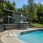 A Grand Welcome - A wraparound deck, inground pool, and upper balcony invite you to take in the forested surroundings, framed by black aluminum railings and Trex boards built for beauty and longevity.