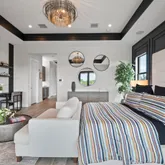 Adjacent to the kitchen is the sun-drenched family room, which boasts expansive zero-entry sliders that extend the living space into the picturesque backyard retreat. Rounding out the first floor is a convenient cabana bath, a stylish powder room showcasing an impressive marble and gold accent wall by Artistic Tile, a private ensuite bedroom, and a thoughtfully designed sleek laundry room.
